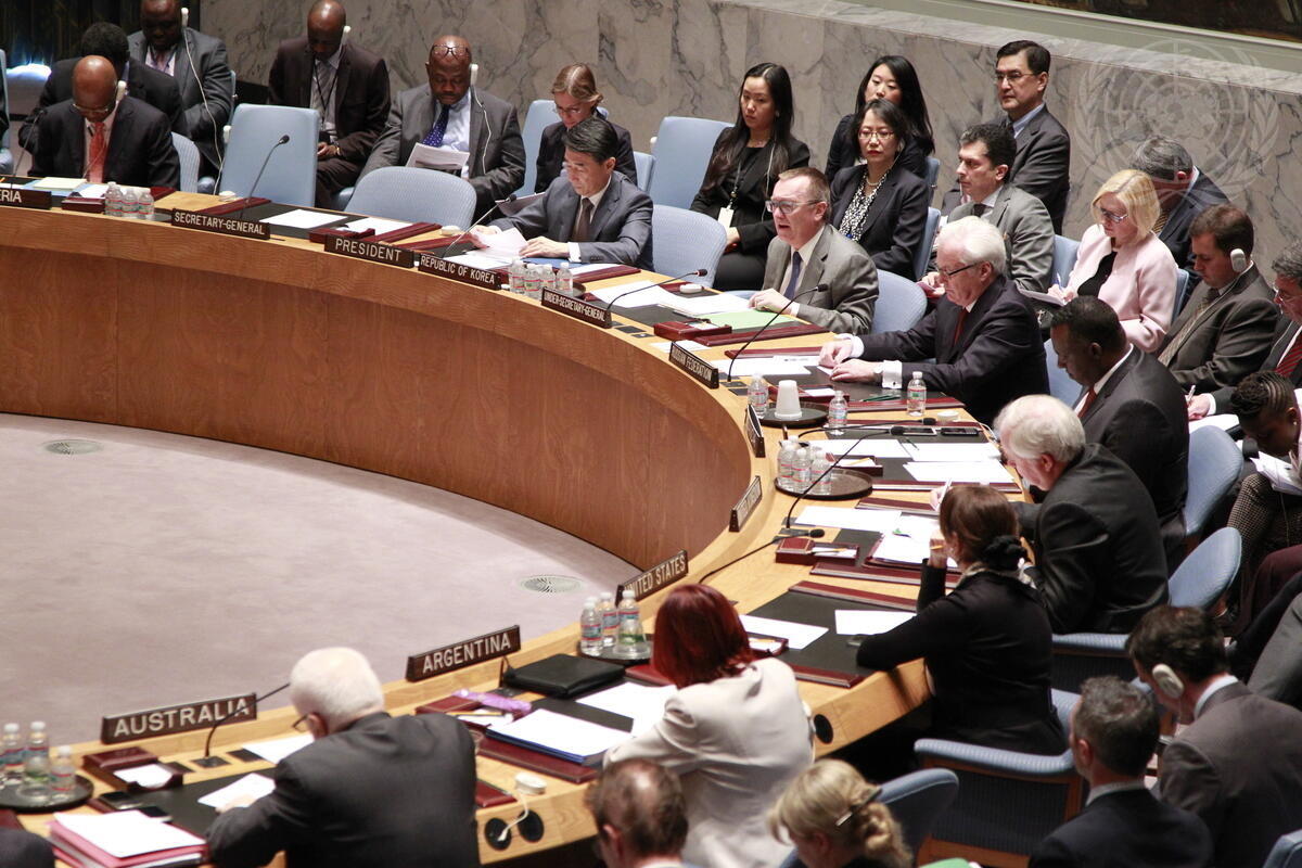 A view of the Security Council Chamber as Jeffrey Feltman (centre), Under-Secretary-General for Political Affairs, briefs the Security Council on the situation in Ukraine.