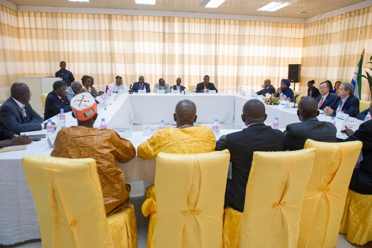 Secretary-General Ban Ki-moon (second from right) meets with with representatives of the ten main political parties of Sierra Leone, in Freetown.