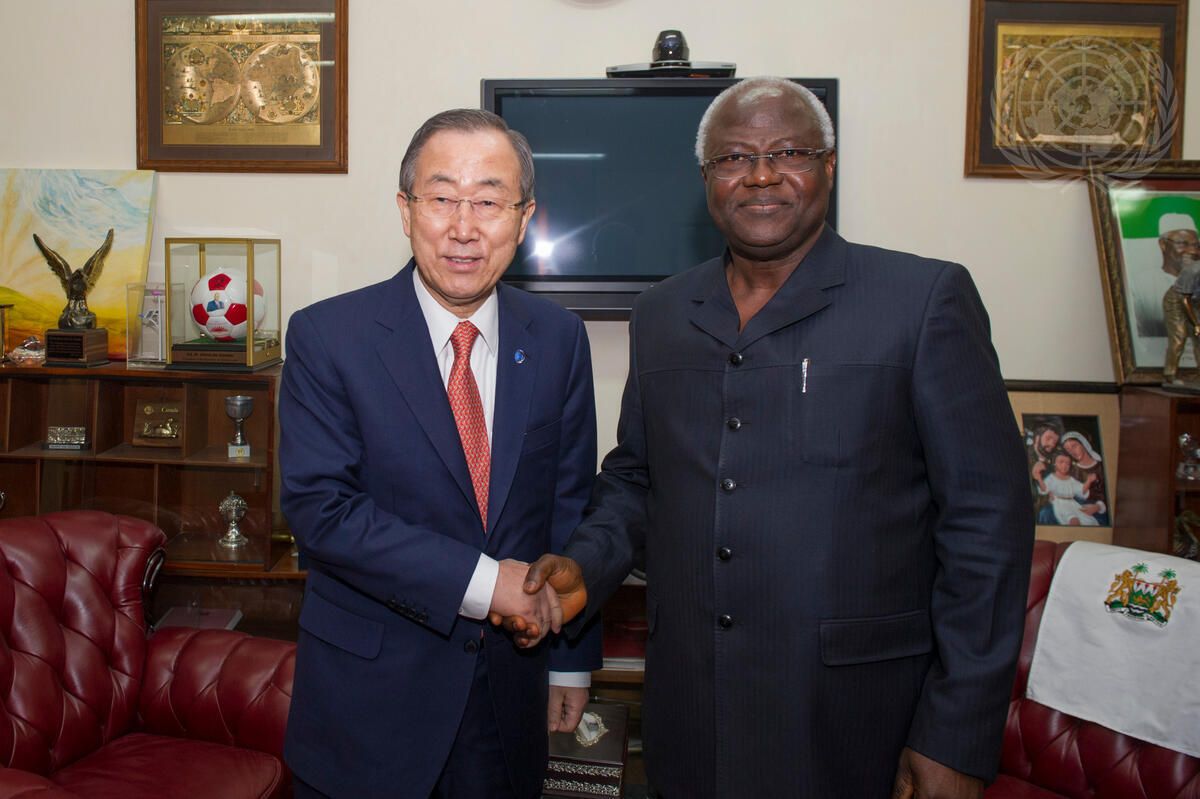Secretary-General Ban Ki-moon (left) meets with Ernest Bai Koroma, President of the Republic of Sierra Leone. The Secretary-General is in Sierra Leone to mark the completion of the UN Integrated Peace Building Mission in the country (UNIPSIL).