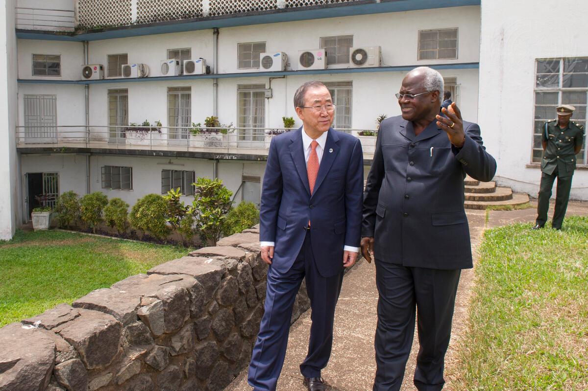 Secretary-General Ban Ki-moon (left) meets with Ernest Bai Koroma, President of the Republic of Sierra Leone. The Secretary-General is in Sierra Leone to mark the completion of the UN Integrated Peace Building Mission in the country (UNIPSIL).