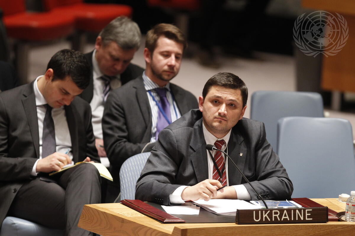 Oleksandr Pavlichenko (behind name plate), Deputy Permanent Reprsentative of Ukraine to the UN, during the Security Council meeting on the situation in his country.