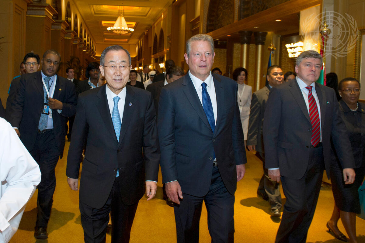 Secretary-General Ban Ki-moon (centre left) and former U.S. Vice President and Nobel Laureate Al Gore (centre right) arrive at a public reception hosted by Sheikh Mohamed bin Zayed Al Nahyan, Crown Prince of Abu Dhabi, and Sheikh Abdullah bin Zayed Al Nahyan, Minister for Foreign Affairs of the United Arab Emirates (UAE).