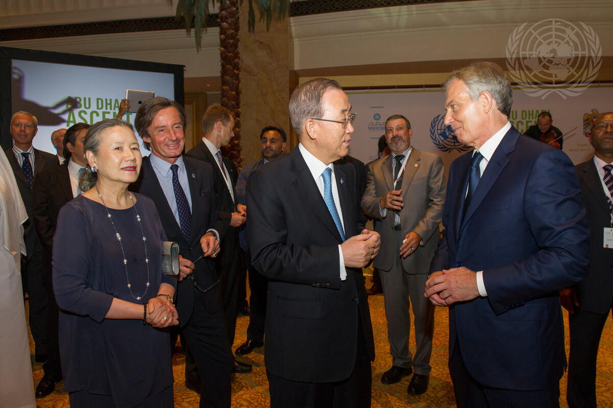 Secretary-General Ban Ki-moon (centre) speaks with former Primer Minister of the United Kingdom and Special Envoy of the Middle East Diplomatic Quartet, Tony Blair (right) during a public reception hosted by the Crown Prince of Abu Dhabi and the Minister of Foreign Affairs for the United Arab Emirates (UAE). Also pictured are Mr. Ban's wife (left), Yoo Soon-taek, and Peter Launsky-Tieffenthal, Under-Secretary-General for Communications and Public Information.