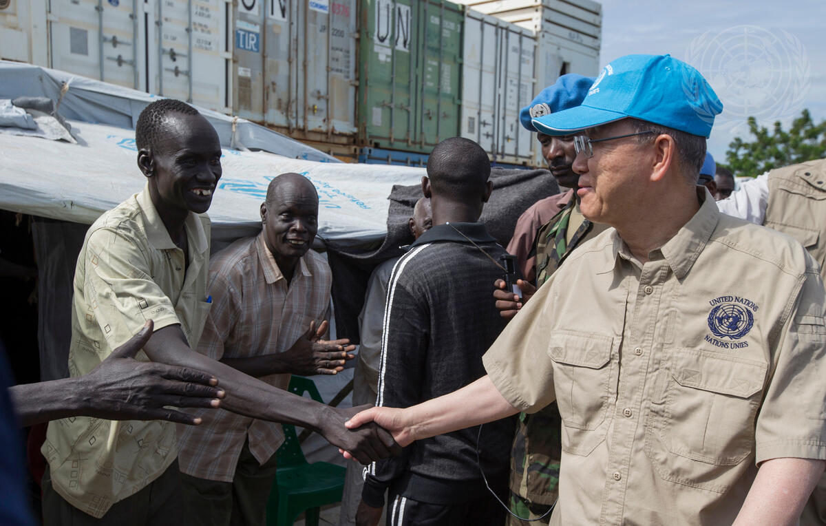 Secretary-General Ban Ki-moon (right) visits the Tomping site of the UN Mission in South Sudan (UNMISS), in Juba, where the UN is protecting approximately 20,000 civilians by the fighting between government and rebel forces which broke out in December.