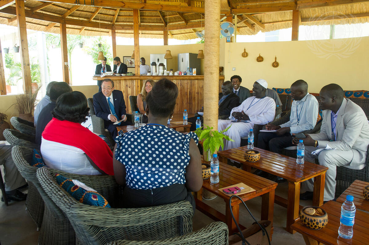 Secretary-General Ban Ki-moon (centre left, facing camera) meets with prominent civil society representatives during his visit to South Sudan. At his side is Hilde Johnson, Special Representative of the Secretary-General and Head of the UN Mission in South Sudan (UNMISS).