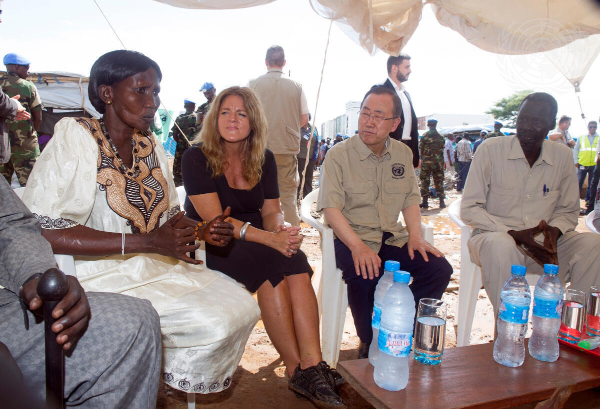 Mr. Ban (centre right) and Hilde F. Johnson (centre left), his Special Representative and Head of the UN Mission in South Sudan (UNMISS), speak with representatives from the site's IDP (Internally Displaced Persons) Leadership Committee.
