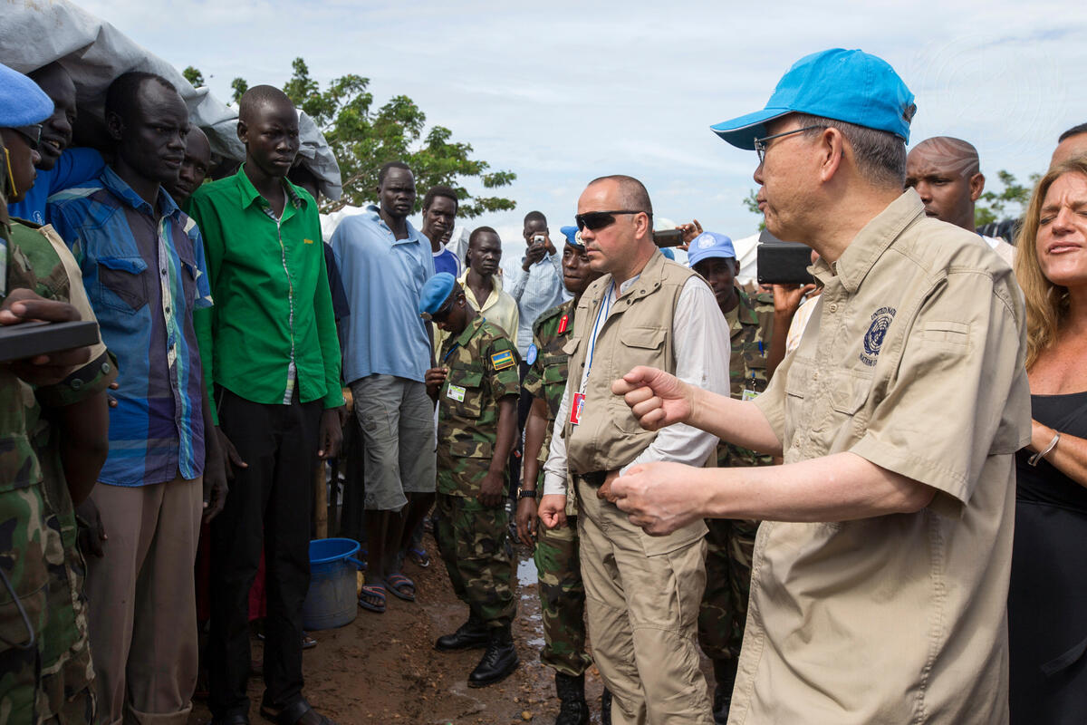 Secretary-General Ban Ki-moon (right) visits the Tomping site of the UN Mission in South Sudan (UNMISS), in Juba, where the UN is protecting approximately 20,000 civilians by the fighting between government and rebel forces which broke out in December.
