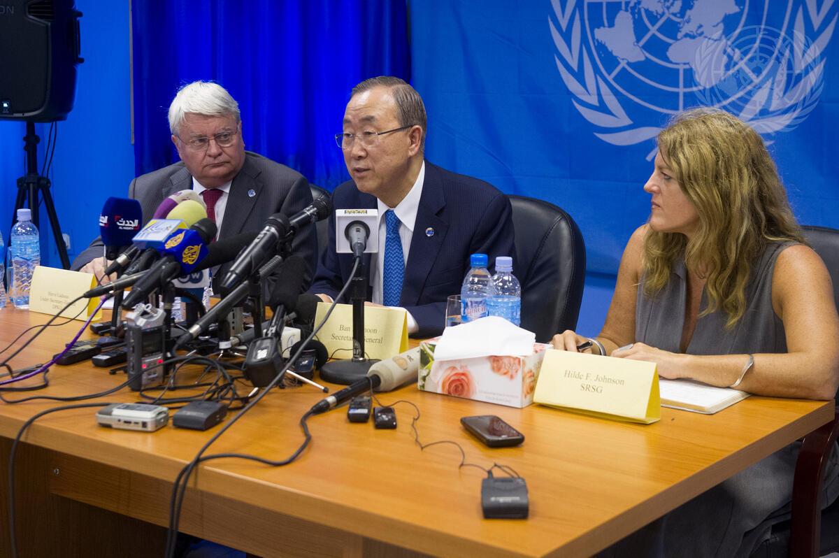 Secretary-General Ban Ki-moon (centre) addresses a press conference at a UN Mission in South Sudan (UNMISS) compound, prior to his departure from Juba after his one-day visit. He is flanked by Hervé Ladsous (left), Under-Secretary-General for Peacekeeping Operations; and Hilde Johnson, Special Representative of the Secretary-General and Head of UNMISS.