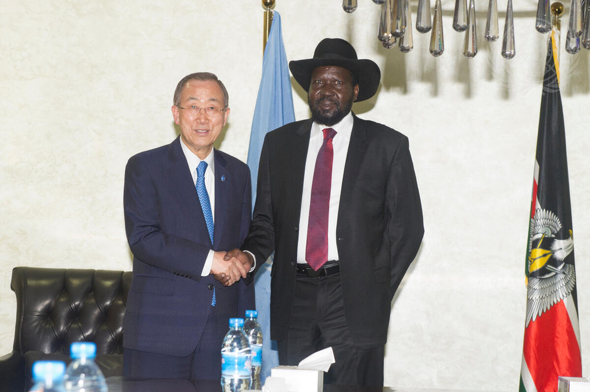 Secretary-General Ban Ki-moon (left) meets with Salva Kiir, President of the Republic of South Sudan, on his visit to the country.