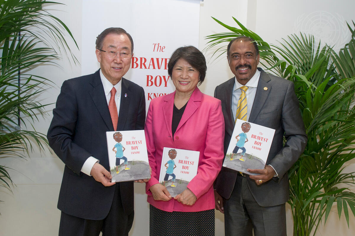 Secretary-General Ban Ki-moon (left) stands with Dho Young-shim (centre), Chairperson of the UNWTO ST-EP (Sustainable Tourism - Eliminating Poverty) Foundation, and Michel Sidibé, Executive Director of the Joint United Nations Programme on HIV and AIDS (UNAIDS), at the launch of a new book from UNAIDS, The Bravest Boy I Know, about two young friends in Africa, one of whom is living with HIV. The book is dedicated to Mr. Ban for his work in prioritizing education through the Global Education First Initiative which aims to put every child in school; improve the quality of learning; and foster global citizenship.