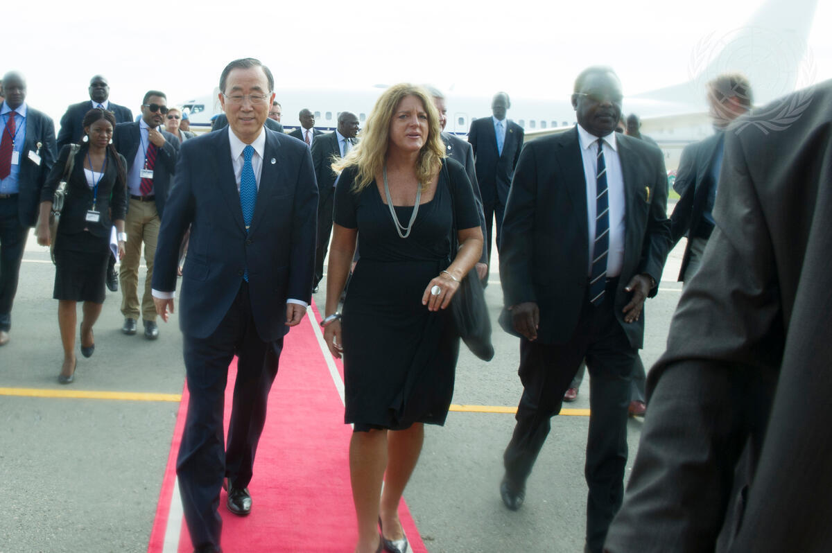 Secretary-General Ban Ki-moon (left) is greeted by Dr. Martin Elia Lomuro (right), Minister of Cabinet Affairs of South Sudan, and Hilde Johnson, Special Representative of the Secretary-General and Head of the United Nations Mission in the Republic of South Sudan (UNMISS), upon arrival in Juba, South Sudan.