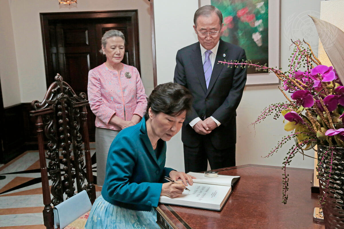 Park Geun-hye, President of the Republic of Korea, signs the guest book at the residence of Secretary-General Ban Ki-moon. Pictured looking on, Mr. Ban and his wife, Yoo Soon-taek.