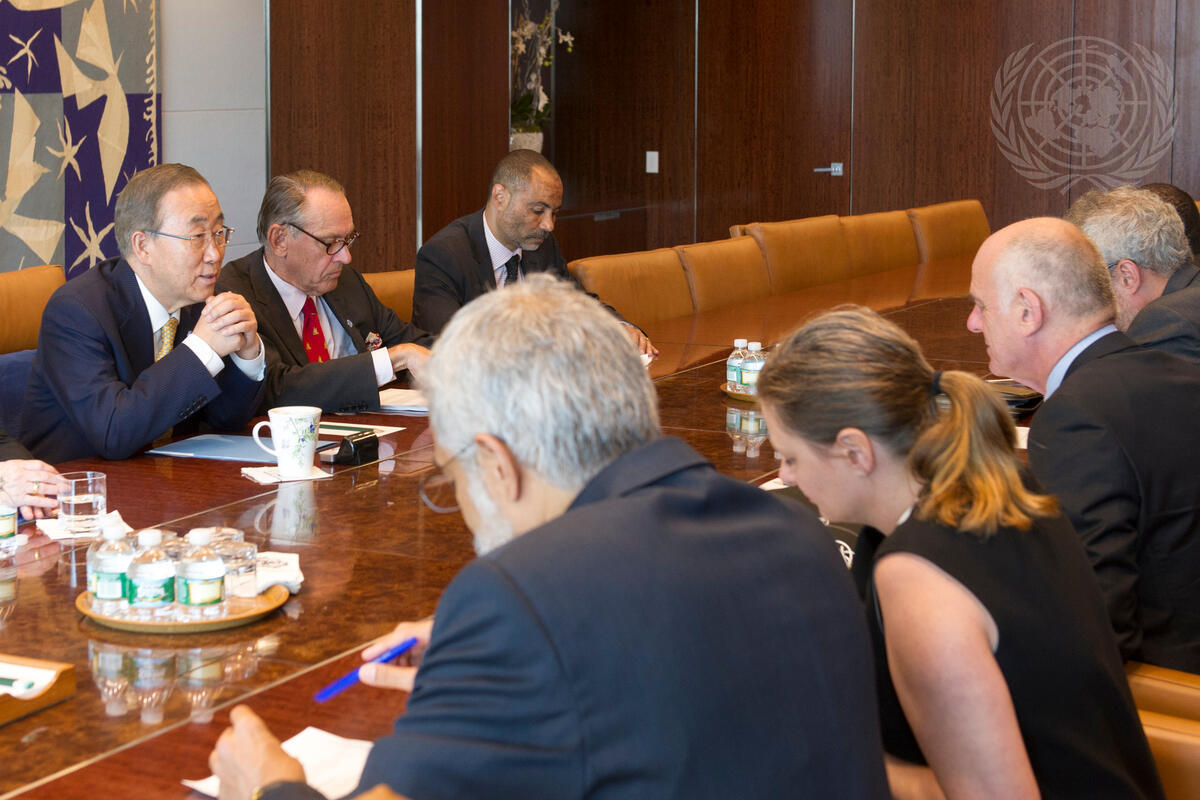 Secretary-General Ban Ki-moon (top left) meets with David Nabarro (foreground third from left), Senior UN System Coordinator for Ebola Virus Disease. Also in the meeting, Deputy Secretary-General Jan Eliasson (top centre).