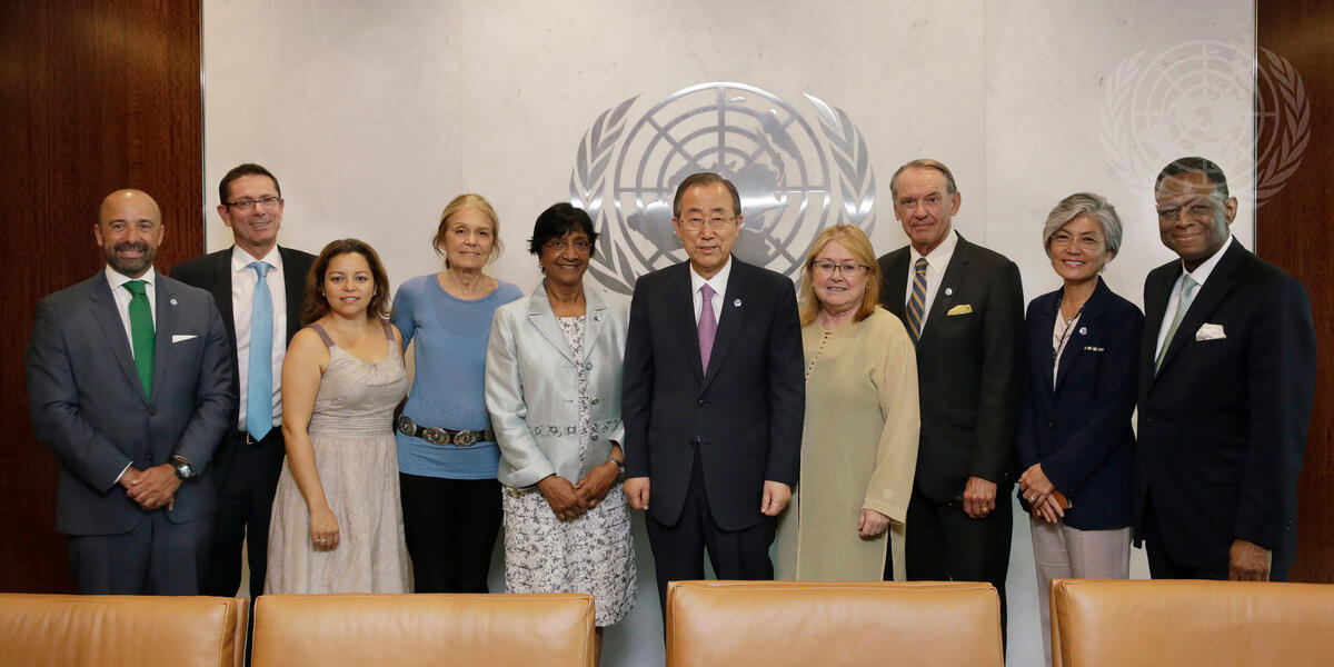 Navi Pillay (centre left), outgoing UN High Commissioner for Human Rights, pays a farewell call on Secretary-General Ban Ki-moon (centre right). Among others, she was joined by: Ivan Šimonovic (second from left), Assistant Secretary-General in the Office of the High Commissioner for Human Rights; Author and Activist Gloria Steinem (fourth from left); Susana Malcorra (fourth from right), Chef de Cabinet to the Secretary-General; Deputy Secretary-General Jan Eliasson (third from right); Kyung-wha Kang (second from right), Assistant Secretary-General for Humanitarian Affairs and Deputy Emergency Relief Coordinator; and Babatunde Osotimehin (far right), Executive Director of the UN Population Fund (UNFPA).