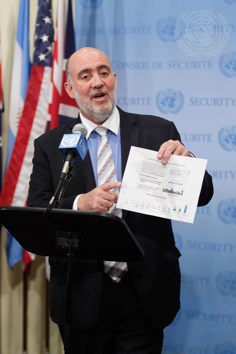 Ron Prosor, Permanent Representative of Israel to the UN, briefs journalists following a Security Council meeting on the situation in the Middle East, including the Palestinian question.