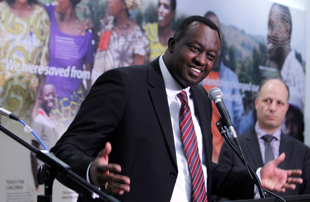 Eugène-Richard Gasana (left), Permanent Representative of the Republic of Rwanda to the UN, speaks at the opening of an exhibit at UN headquarters entitled, “Kwibuka20: Memory, Unity and Renewal in Rwanda After the Genocide,” organized by the Government of Rwanda. At right is Maher Nasser, Director of the Outreach Division and Officer-in-Charge, at the UN Department of Public Information (DPI).