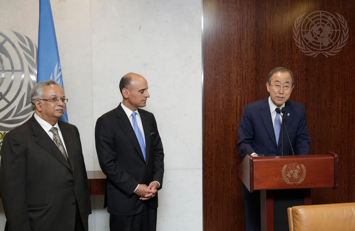 Mr. Ban (right) delivers remarks on the occasion, as Ambassadors Al-Jubeir (centre) and Al-Mouallimi look on.