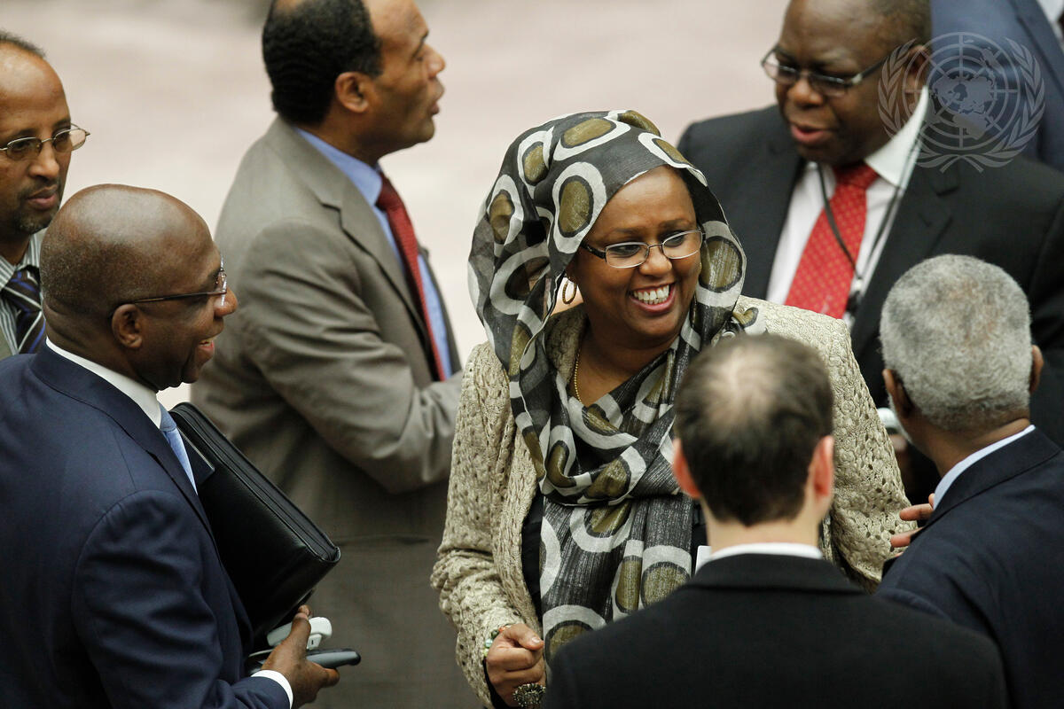 Fowsiyo Yusuf Haji Adan (centre), Deputy Prime Minister and Minister for Foreign Affairs of the Somali Republic, addressed the Security Council meeting on the situation in her country. She is seen with delegates on the floor of the Interim Council Chamber at the conclusion of the meeting.