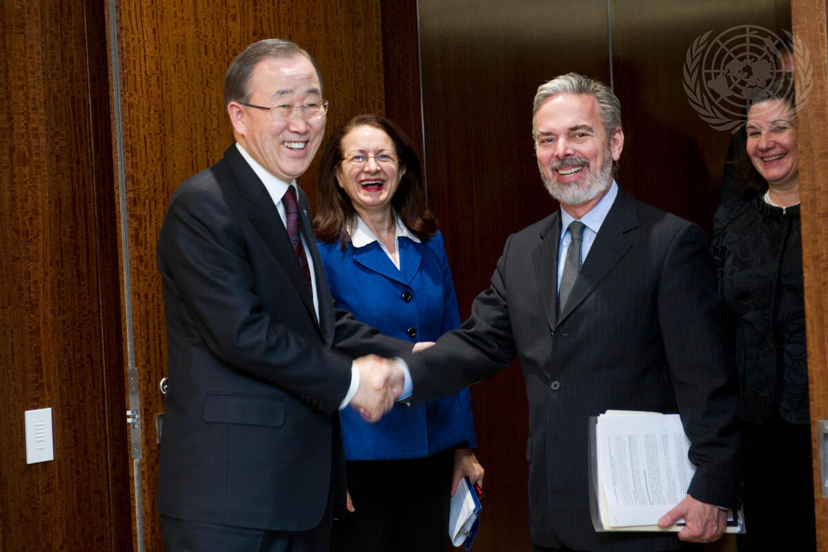 Secretary-General Ban Ki-moon (left) meets with Antonio de Aguiar Patriota, Minister for External Relations of Brazil. At right is Maria Luiza Ribeiro Viotti, Permanent Representative of Brazil to the UN.