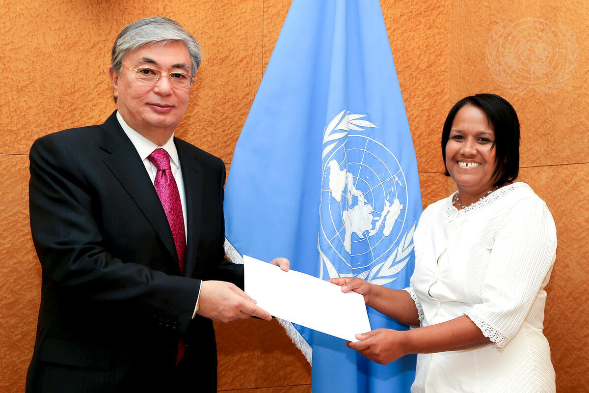 Anayansi Rodríguez Camejo, new Permanent Representative of Cuba to the United Nations Office at Geneva (UNOG), presents her credentials to UNOG Director-General Kassym-Jomart Tokayev.