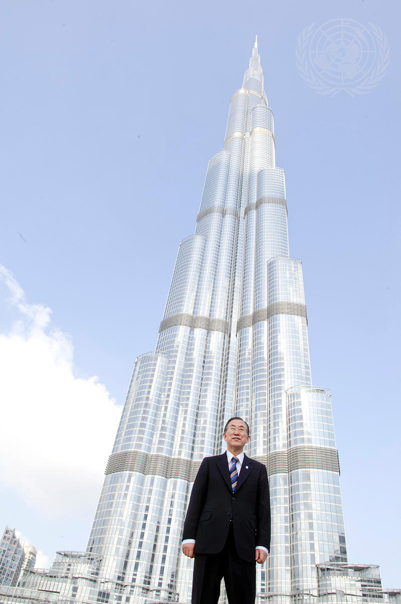 Secretary-General Ban Ki-moon visits Burj Khalifa (Khalifa Tower), a skyscraper in Dubai, United Arab Emirates. It is the world's tallest man-made structure since 2010, standing at 829.8 meters.