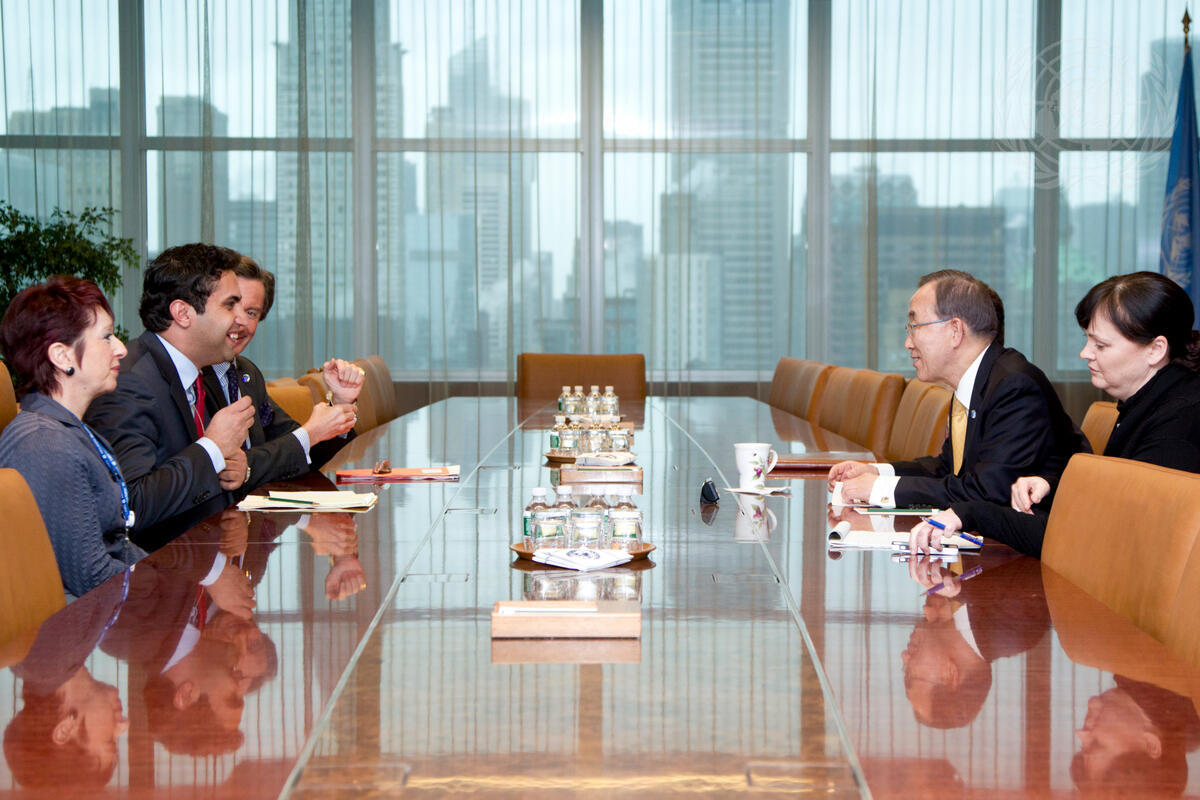 Secretary-General Ban Ki-moon (second from right) meets with Ahmad Alhendawi (second from left), his Envoy on Youth.