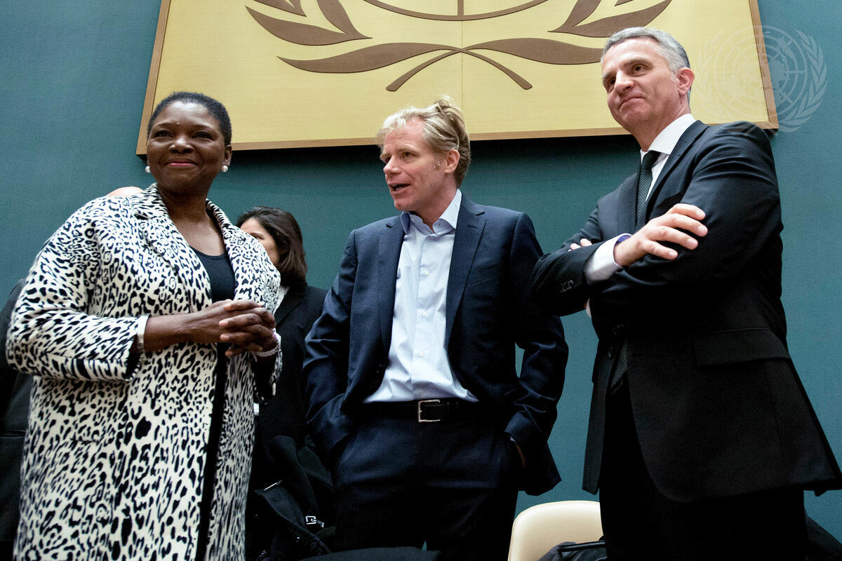 At the meeting, from left: Valerie Amos, Under-Secretary-General for Humanitarian Affairs; Bruce Aylward, Assistant Director-General for Polio, Emergencies and Country Collaboration at the World Health Organization (WHO); and Didier Burkhalter, Head of the Swiss Federal Department of Foreign Affairs.