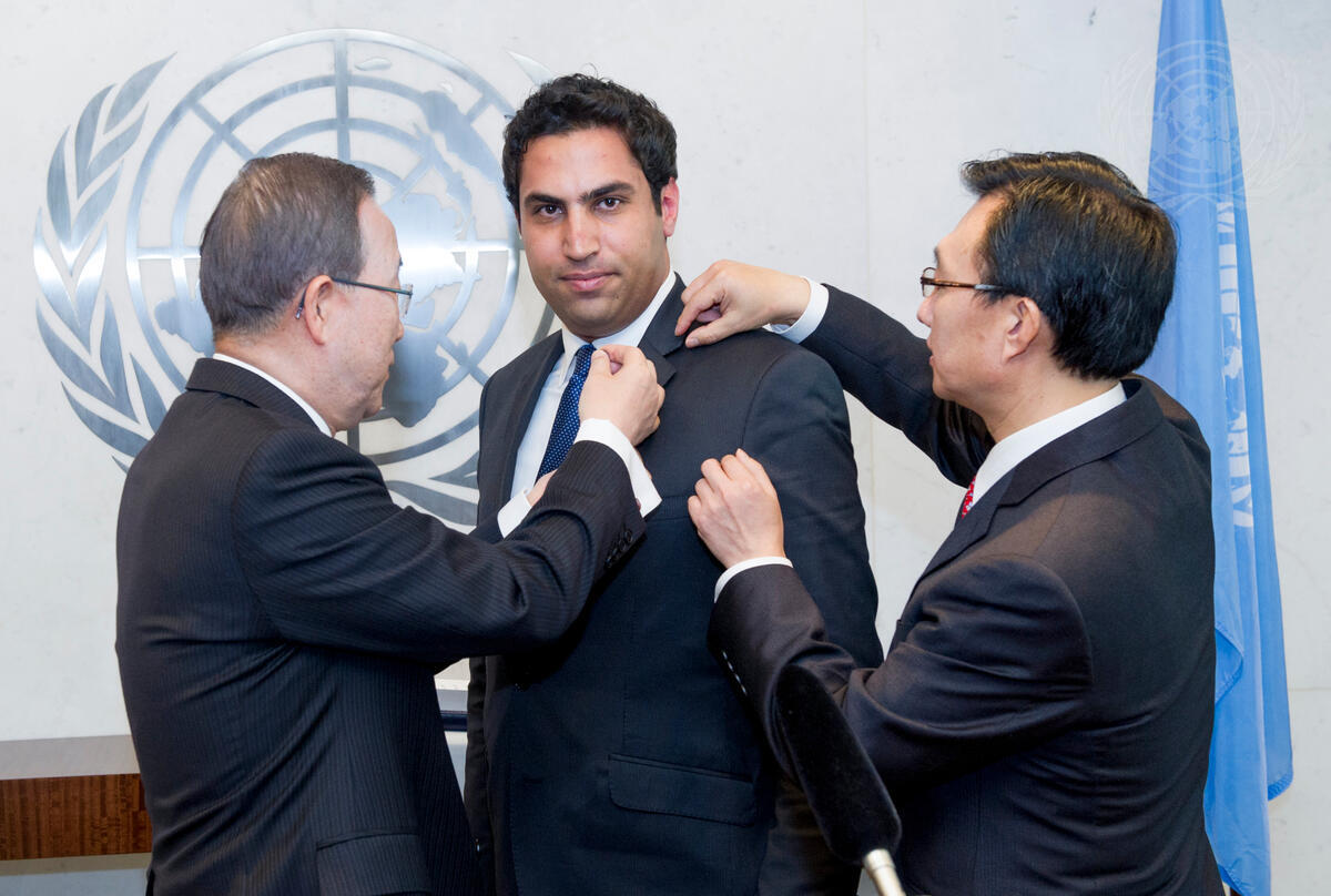 Secretary-General Ban Ki-moon (left) affixes a UN lapel pin for his Envoy on Youth, Ahmad Alhendawi (centre), following the latter’s swearing in. At right is Yoon Yeocheol, UN Chief of Protocol.