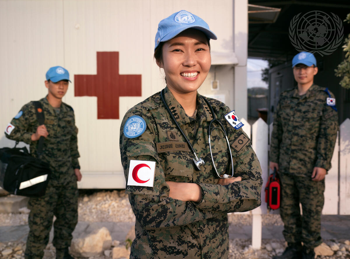 Eun-Bi Jeong, Nurse Officer, and two of her colleagues photographed next to clinic of the Korean Contingent Headquaters at UN Post 2-5 at the vicinity of Tyre, South Lebanon.