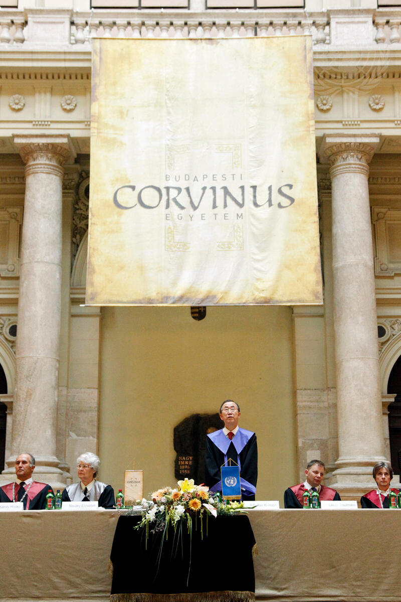 Secretary-General Ban Ki-moon (centre) during the ceremony where he received an Honorary Doctorate from Corvinus University of Budapest.
