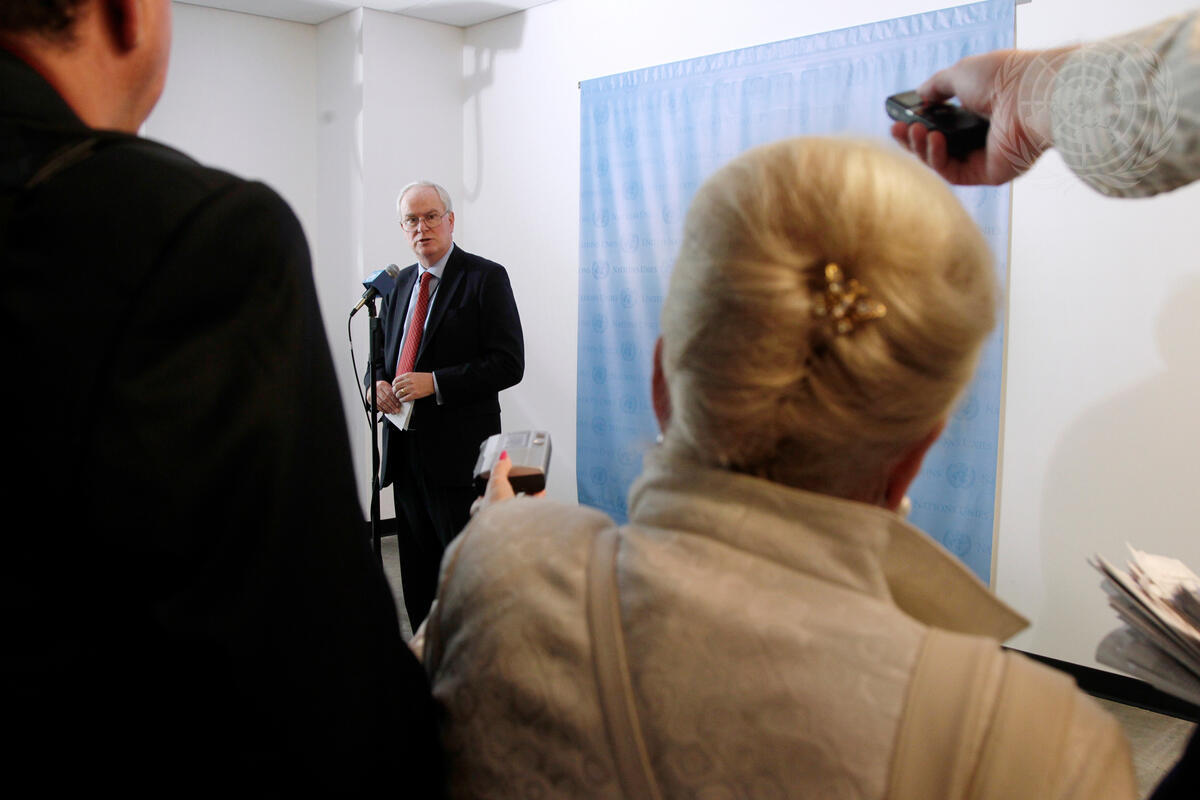 Mark Lyall Grant, Permanent Representative of the United Kingdom, speaks to the press after meeting with Syrian opposition leaders.