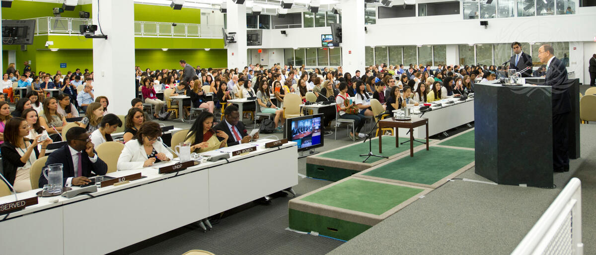 In advance of International Youth Day (12 August), Secretary-General Ban Ki-moon (at podium) speaks to young people in the audience at United Nations Headquarters as well as youth connected via video link from Africa, Latin-America, Europe, Asia and the Middle East. The global, interactive dialogue will highlight the UN”s youth initiatives around the world. Behind Mr. Ban is Ahmad Alhendawi, Envoy on Youth, who moderated the event.