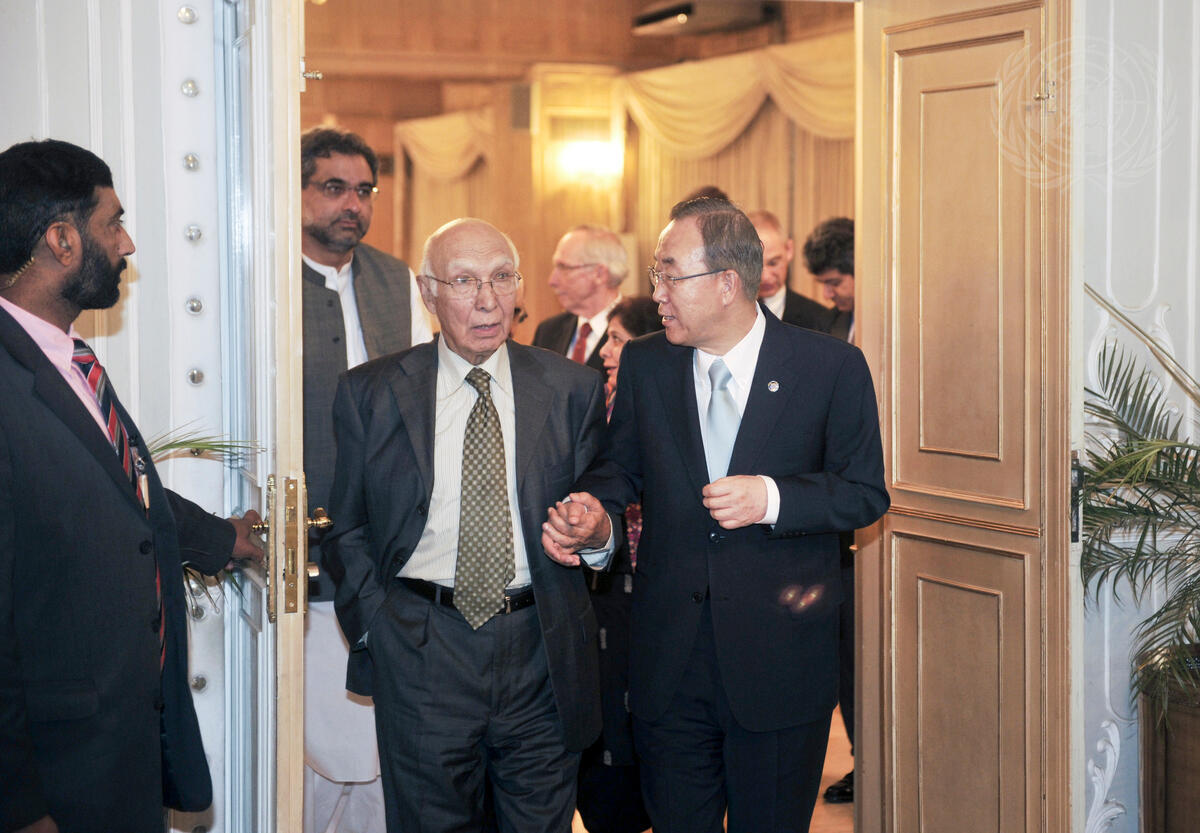 Secretary-General Ban Ki-moon (centre right) meets with Sartaj Aziz (centre left), Advisor to Pakistan’s Prime Minister on National Security and Foreign Affairs.