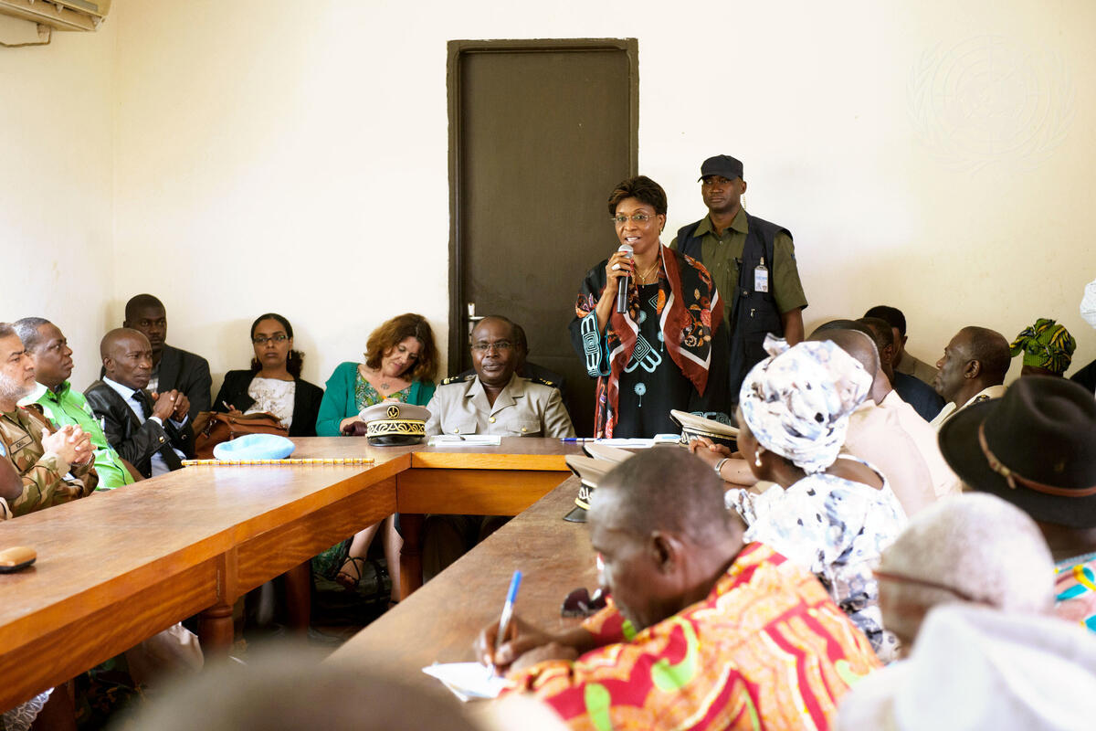 Aïchatou Mindaoudou Souleymane (holding microphone), Special Representative of the Secretary-General and Head of the United Nations Operation in Côte d’Ivoire (UNOCI), speaks with local leaders in the prefecture of Issia in Côte d'Ivoire.