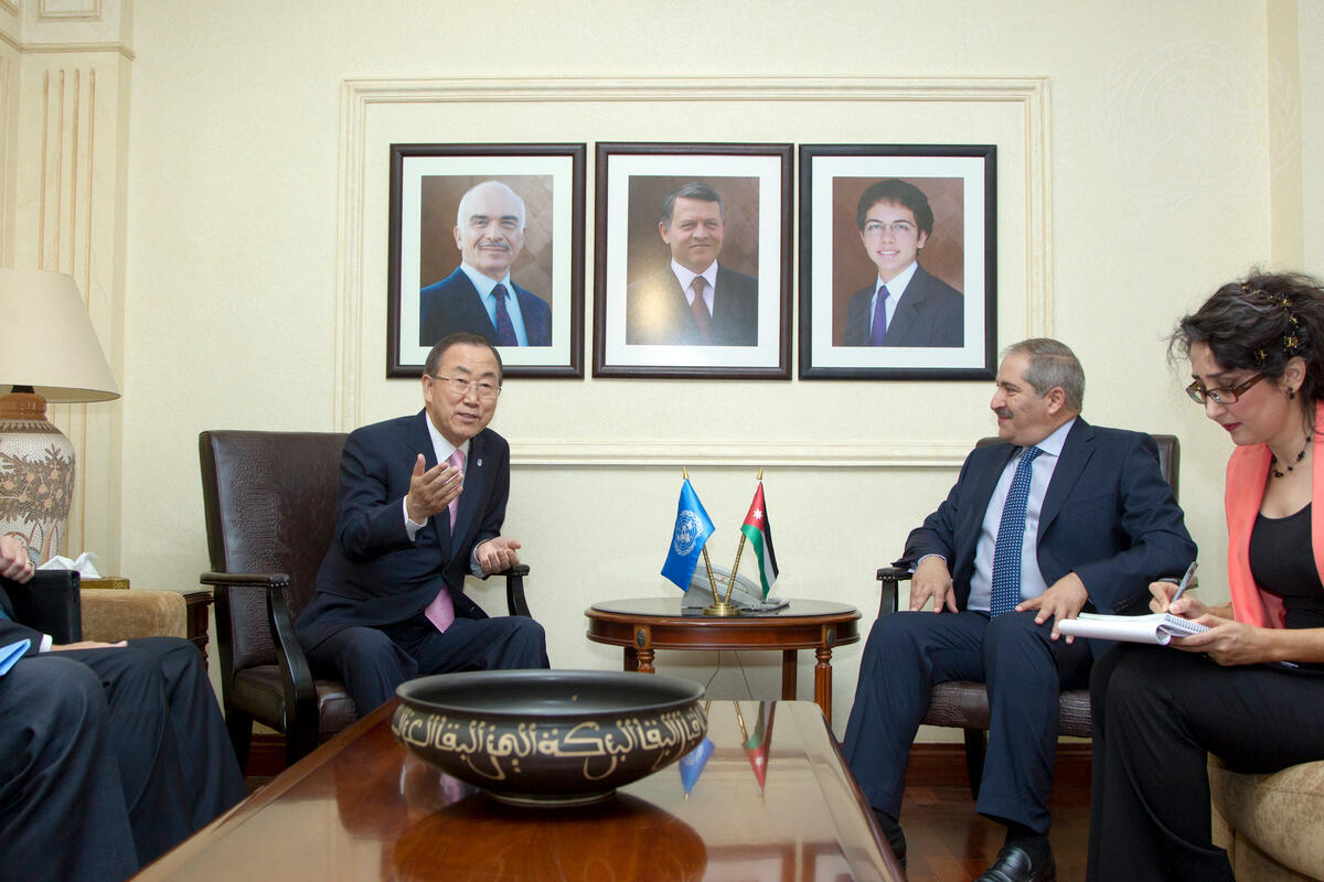 Secretary-General Ban Ki-moon (left) meets with Nasser Judeh (second from right), Minister for Foreign and Expatriates Affairs of the Hashemite Kingdom of Jordan.