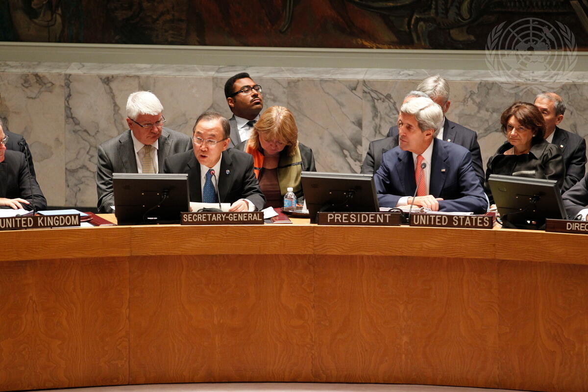 Secetary-General Ban Ki-moon (centre left) addresses the Council. On his left is John Kerry, United States Secretary of State and President of the Security Council for the month of July.