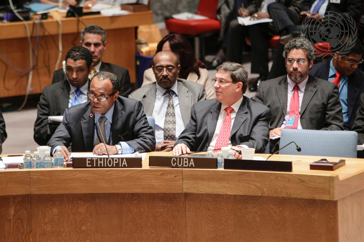 Tekeda Alemu, Permanent Representative of the Federal Democratic Republic of Ethiopia to the United Nations, addresses a meeting of the Security Council on cooperation between the UN and regional and subregional organizations in maintaining international peace and security. On the right is Bruno Rodríguez Parrilla, Minister for Foreign Affairs of Cuba.