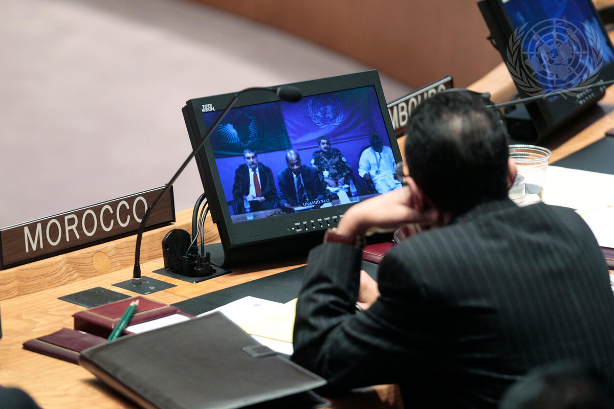 A Security Council delegate watches on video screen Mohamed Ibn Chambas, Joint Special Representative and Head of the African Union and United Nations Mission in Darfur (UNAMID), addressing the Council meeting on UNAMID via video conference.