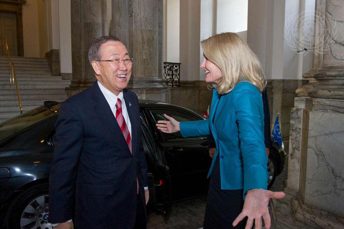 Secretary-General Ban Ki-moon (left) shares a laugh with Danish Prime Minister, Helle Thorning-Schmidt, as he arrives for their meeting in Copenhagen.