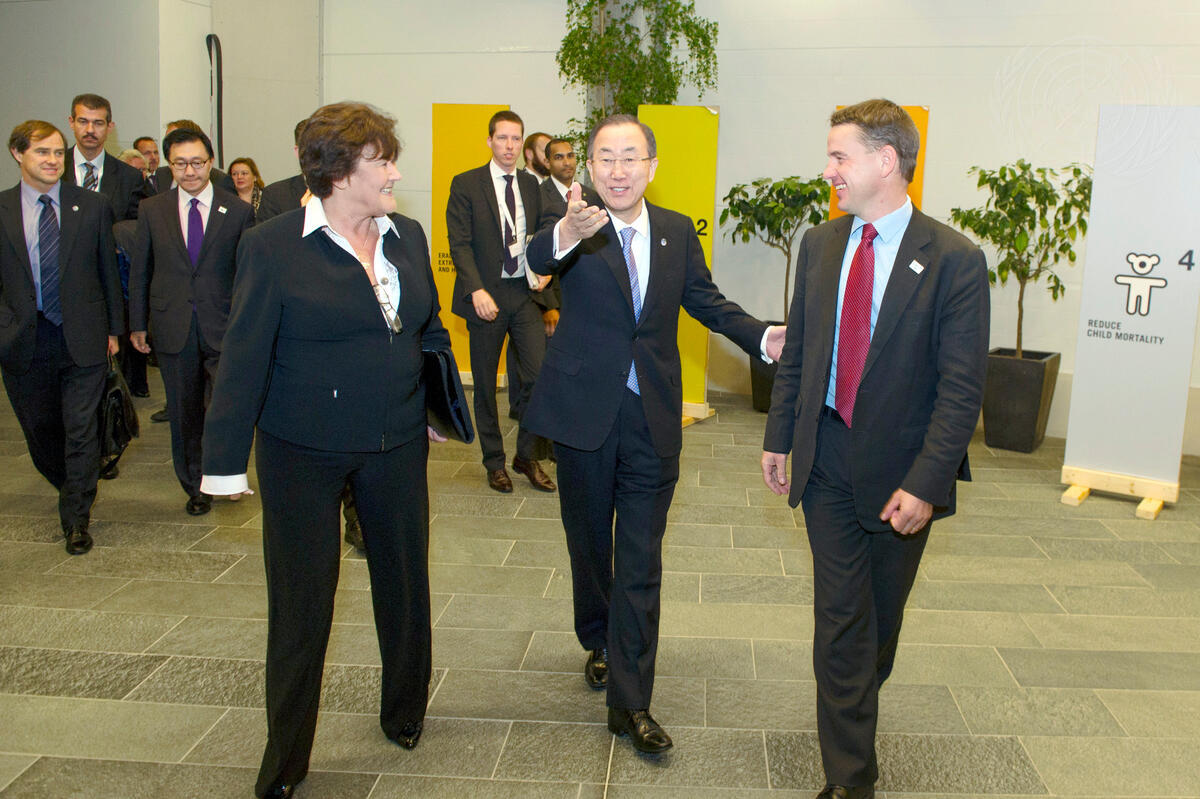 Secretary-General Ban Ki-moon (centre) arrives for a working breakfast hosted by Christian Friis Bach (right), Minister for Development Cooperation of Denmark. On Mr. Ban’s right is Szuszanna Jakab, Regional Director for Europe of the World Health Organization (WHO).
