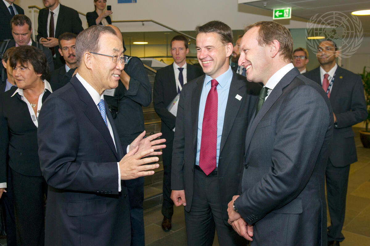 Secretary-General Ban Ki-moon (left) speaks with Christian Friis Bach (centre), Minister for Development Cooperation of Denmark, and Martin Lidegaard, Denmark’s Minister for Climate, Energy and Building, on the sidelines of the Copenhagen Climate Finance Meeting.