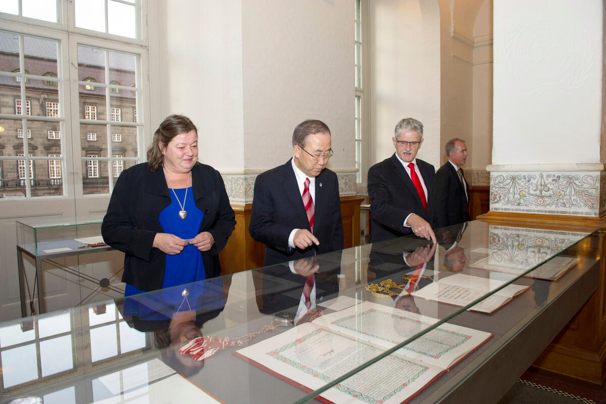 Secretary-General Ban Ki-moon (second from left) is accompanied on a tour of the Danish Parliament by Parliament Speaker, Mogens Lykketoft (right of Mr. Ban), in Copenhagen.