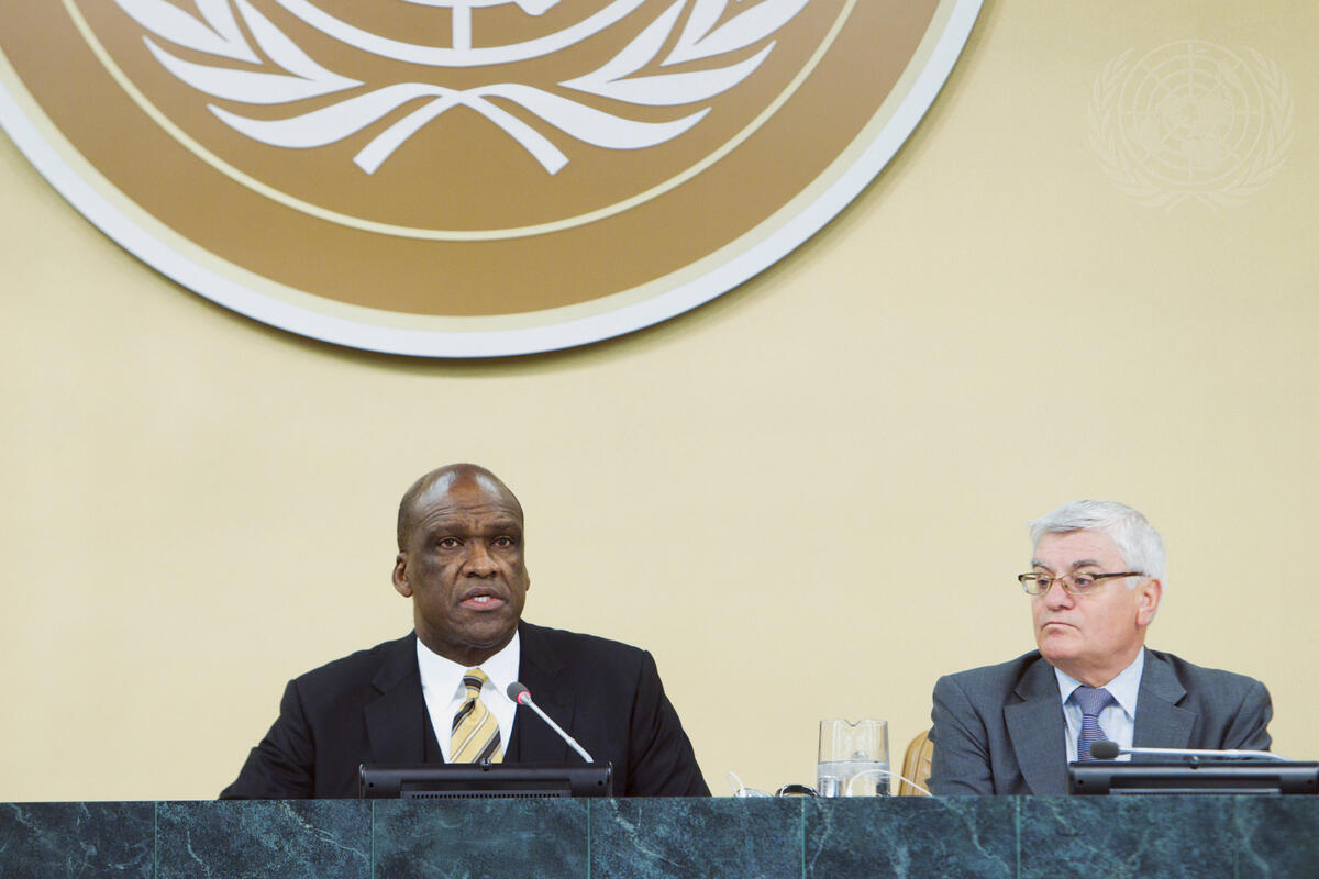 John Ashe (left), President of the sixty-eighth session of the General Assembly, chairs the Assembly’s meeting on the “Follow-up to the Commemoration of the two-hundredth anniversary of the abolition of the transatlantic slave trade”. On right is Ion Botnaru, Director of the General Assembly and Economic and Social Council (ECOSOC) Affairs Division.
