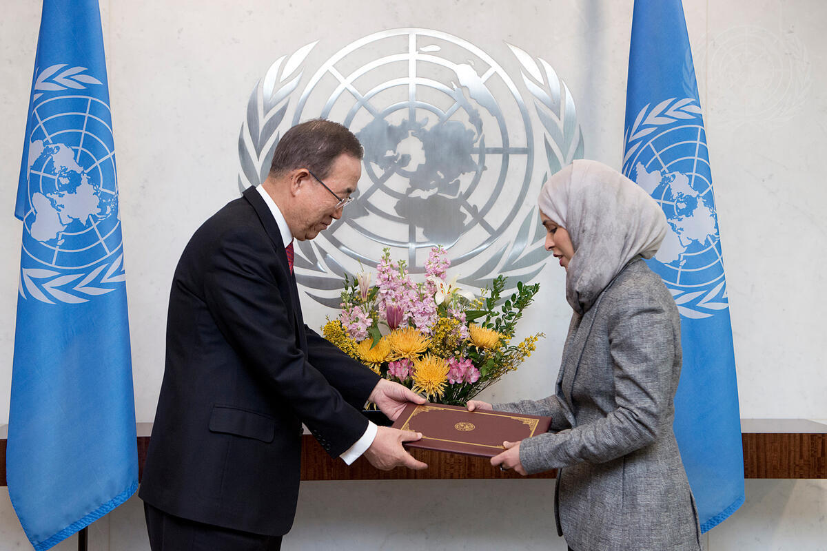 Alya Ahmed Saif Al-Thani (right), new Permanent Representative of the State of Qatar to the United Nations, presents her credentials to Secretary-General Ban Ki-moon.
