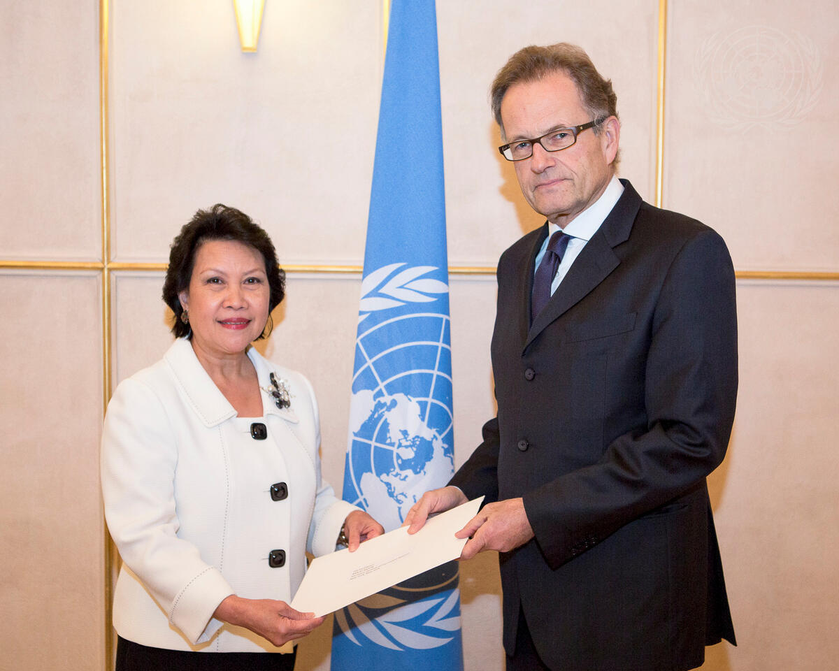 Cecilia R. Rebong (left), new Permanent Representative of the the Republic of the Philippines to the UN Office at Geneva (UNOG), presents her credentials to Michael Møller, Acting Director-General of UNOG.