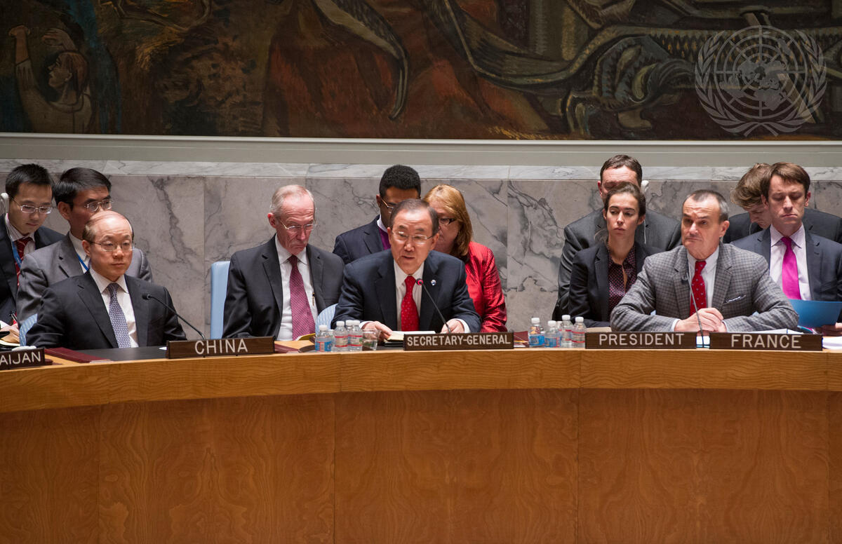 Secretary-General Ban Ki-moon appears before the Security Council. On either side, listening, are Liu Jieyi (left), Permanent Representative of China to the UN and Gérard Araud, Permanent Representative of France to the UN and current Security Council President.