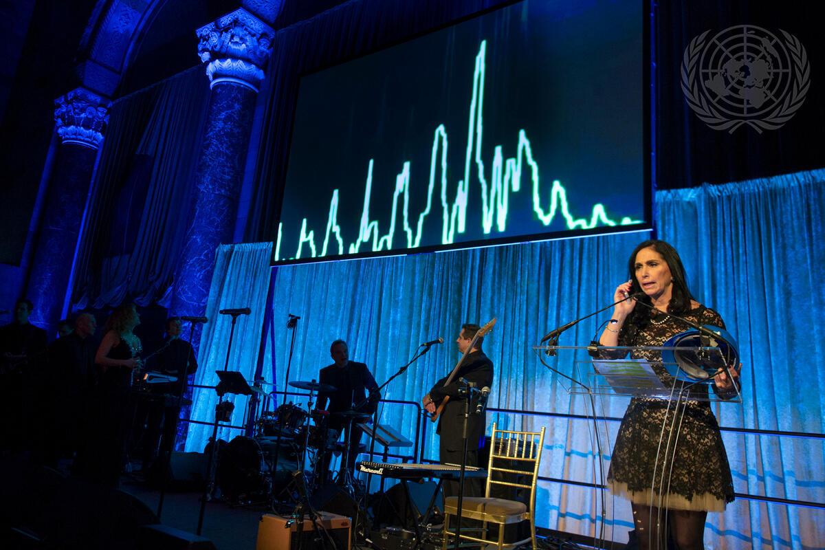 Pamela S. Falk (right), President of the UN Correspondents Association (UNCA), speaking at the Association’s 2013 Annual Awards Dinner and Dance honouring winners of prizes for best media coverage of the UN.