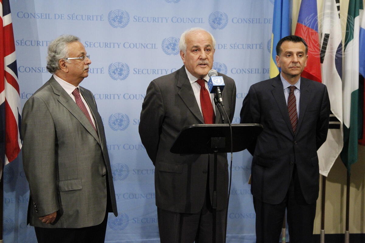 Riyad H. Mansour (centre), Permanent Observer of the State of Palestine to the UN, speaks to journalists following an emergency meeting of the Security Council on the ongoing conflict in Gaza. Joining him were Abdallah Y. Al-Mouallimi (left), Permanent Representative of Saudi Arabia to the UN; and Mahmoud Daifallah Mahmoud Hmoud, Senior Deputy Permanent Representative of the Hashemite Kingdom of Jordan.