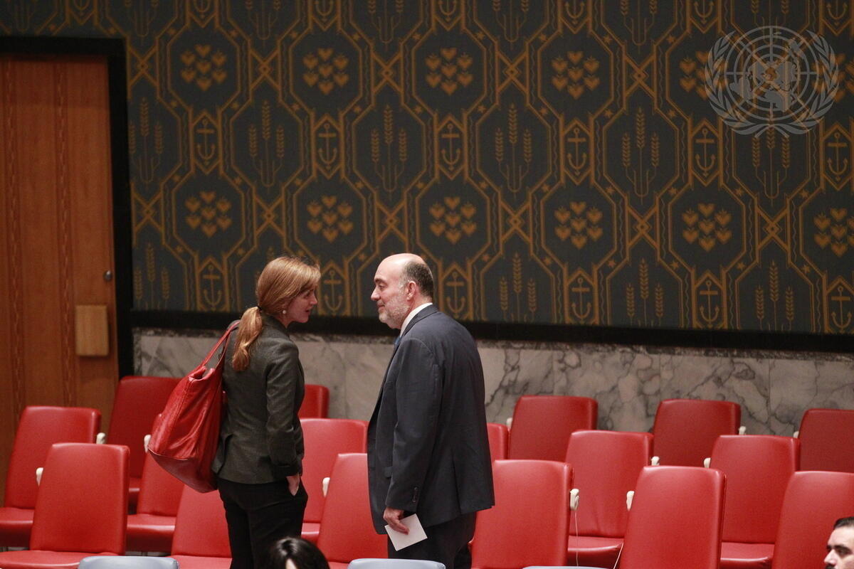 Samantha Power (left), United States Permanent Representative to the UN, speaks with Ron Prosor, Permanent Representative of Israel, in the Council Chamber.