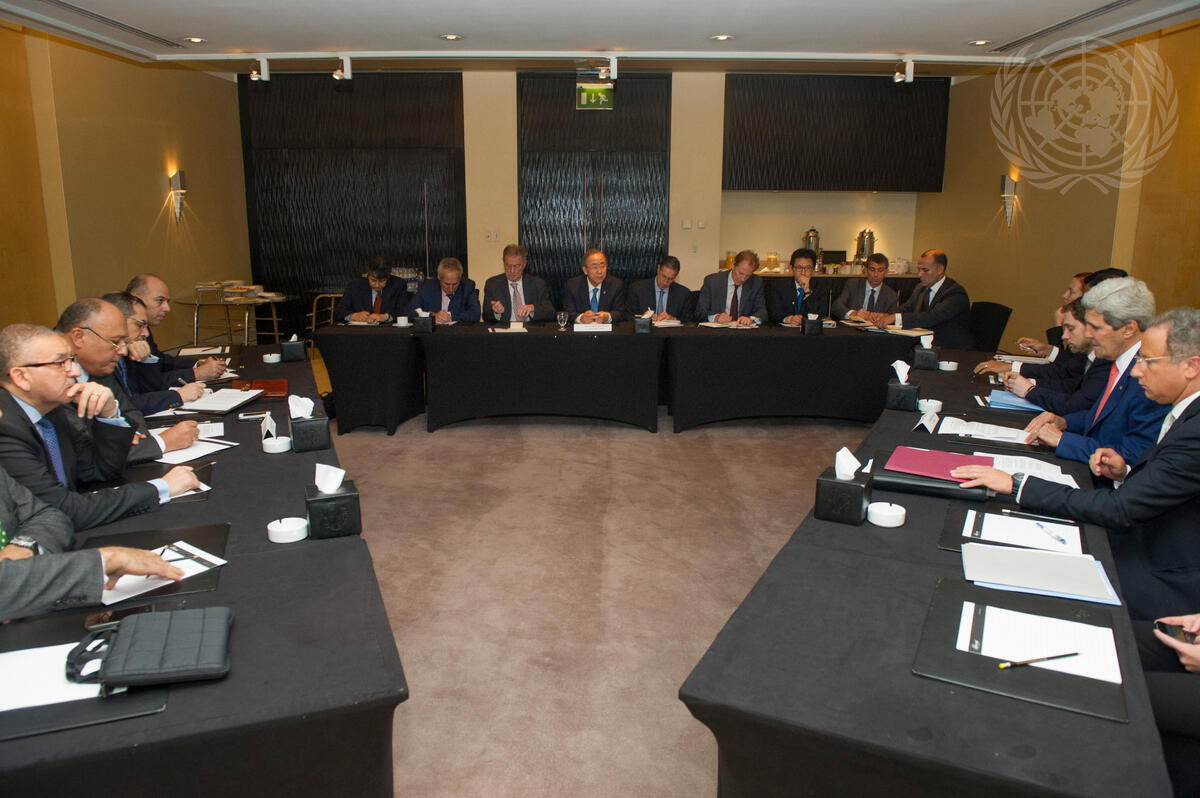 A view of the tri-partite meeting in Cairo between Secretary-General Ban Ki-moon (fourth from left, top); Sameh Hassan Shokry Selim (second from left, foreground), Minister for Foreign Affairs of the Arab Republic of Egypt; and United States Secretary of State John Kerry (second from right, foreground).